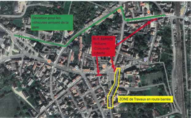 Lorsque le carrefour de la place de la République sera en travaux, une déviation locale sera mise en place. Pour les véhicules arrivant de la rue de la Gare, la rue Voltaire sera déviée en passant par la rue de la Gare, la rue Victor Hugo et la rue Emile Zola.
